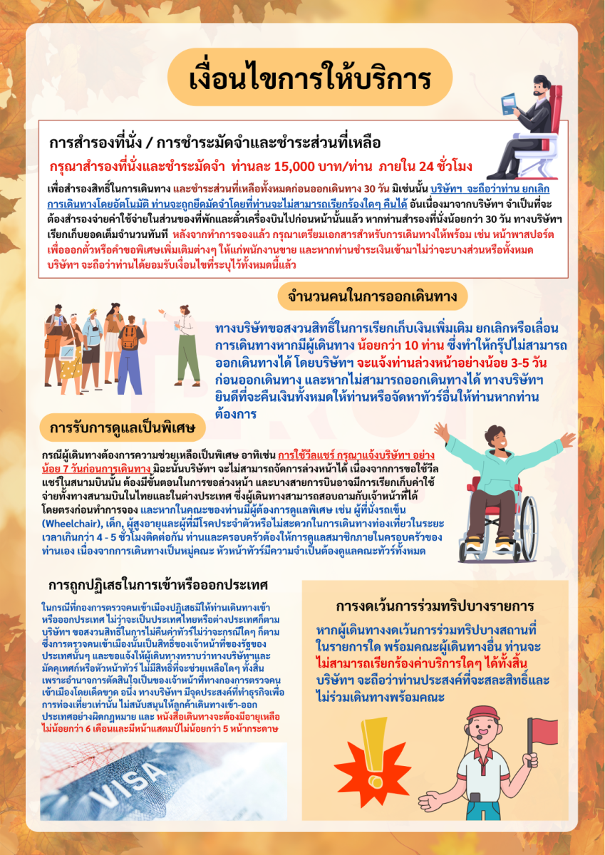 | วันเดินทางไป - กลับ | ผู้ใหญ่ท่านละ | พักเดี่ยวเพิ่มเงิน | ราคาเด็กท่านละ | ว่าง | |
